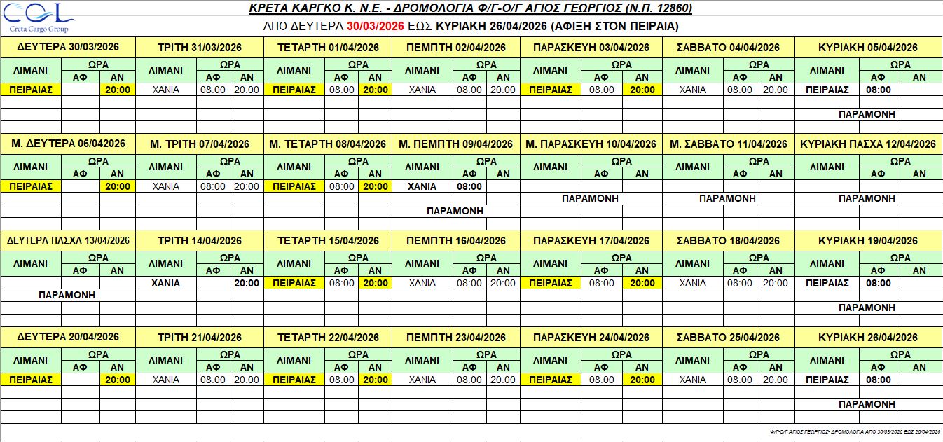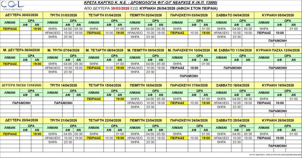 Η CRETA CARGO LINES ενημερώνει για τα δρομολόγια που θα εκτελέσουν τα οχηματαγωγά πλοία της, από 30 Μαρτίου 2026 έως 28 Απριλίου 2026.