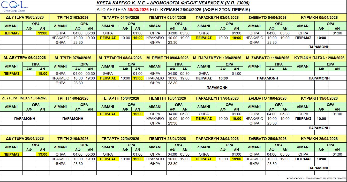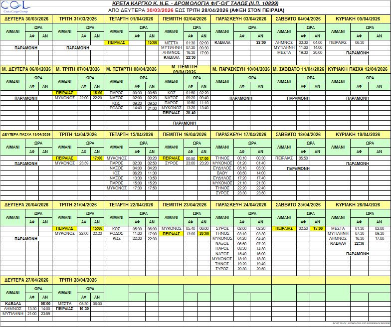 Σας γνωρίζουμε τα δρομολόγια που θα εκτελέσει το πλοίο μας από Δευτέρα 30/03/2026 έως Τρίτη 28/04/2026 ως κάτωθι πίνακας: