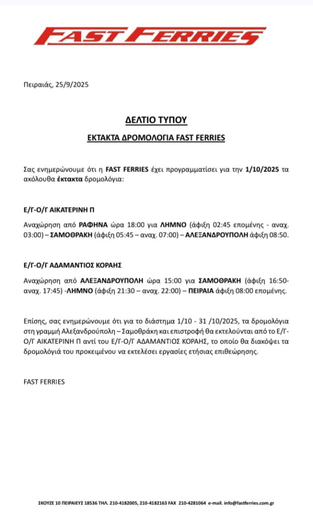Έκτακτα δρομολόγια των ΑΙΚΑΤΕΡΙΝΗ Π & ΑΔΑΜΑΝΤΙΟΣ ΚΟΡΑΗΣ την 1η Οκτωβρίου