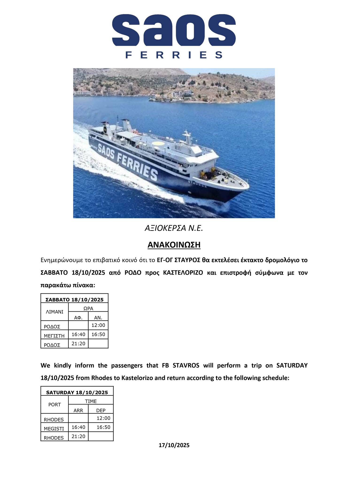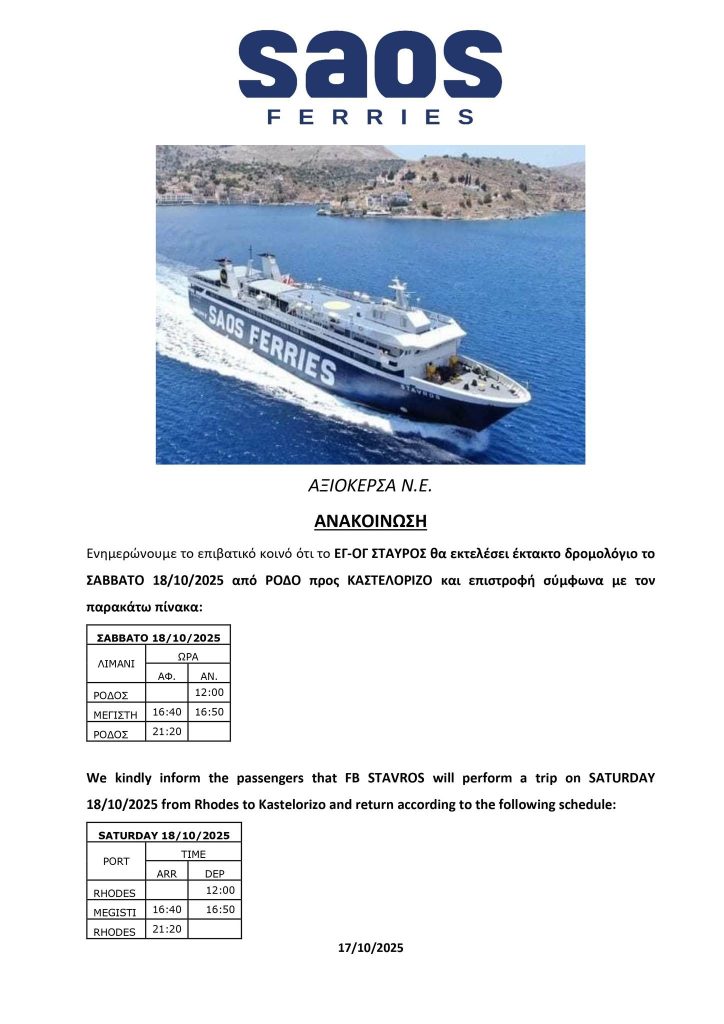 Έκτακτο δρομολόγιο Ρόδος-Καστελόριζο του ΣΤΑΥΡΟΣ το Σάββατο 18/10
