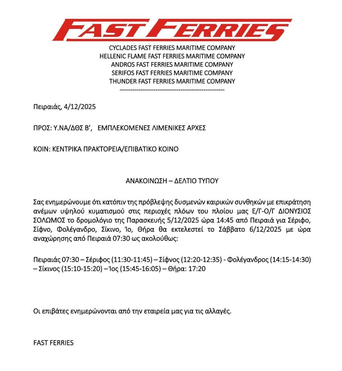 Ακύρωση δρομολογίου ΔΙΟΝΥΣΙΟΣ ΣΟΛΩΜΟΣ την Παρασκευή 5/12 & μεταφορά του για Σάββατο 6/12