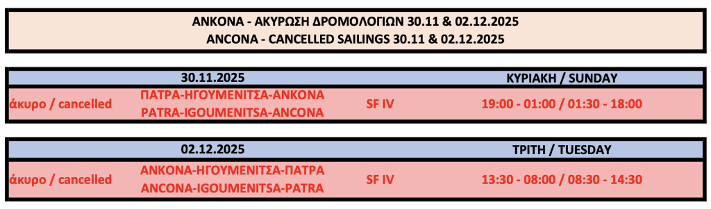 Ακύρωση δρομολογίων του SUPERFAST IV στη γραμμή της Ανκόνα 30.11 & 02.12
