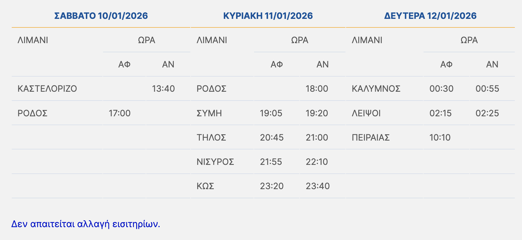 Το BLUE STAR PATMOS, θα παραμείνει στο λιμάνι της Ρόδου το Σάββατο 10/01/2026 μέχρι την βελτίωση των καιρικών συνθηκών, επομένως τα δρομολόγια του μέχρι τη Δευτέρα 12/01/2026, θα διαμορφωθούν σύμφωνα με τον παρακάτω πίνακα: