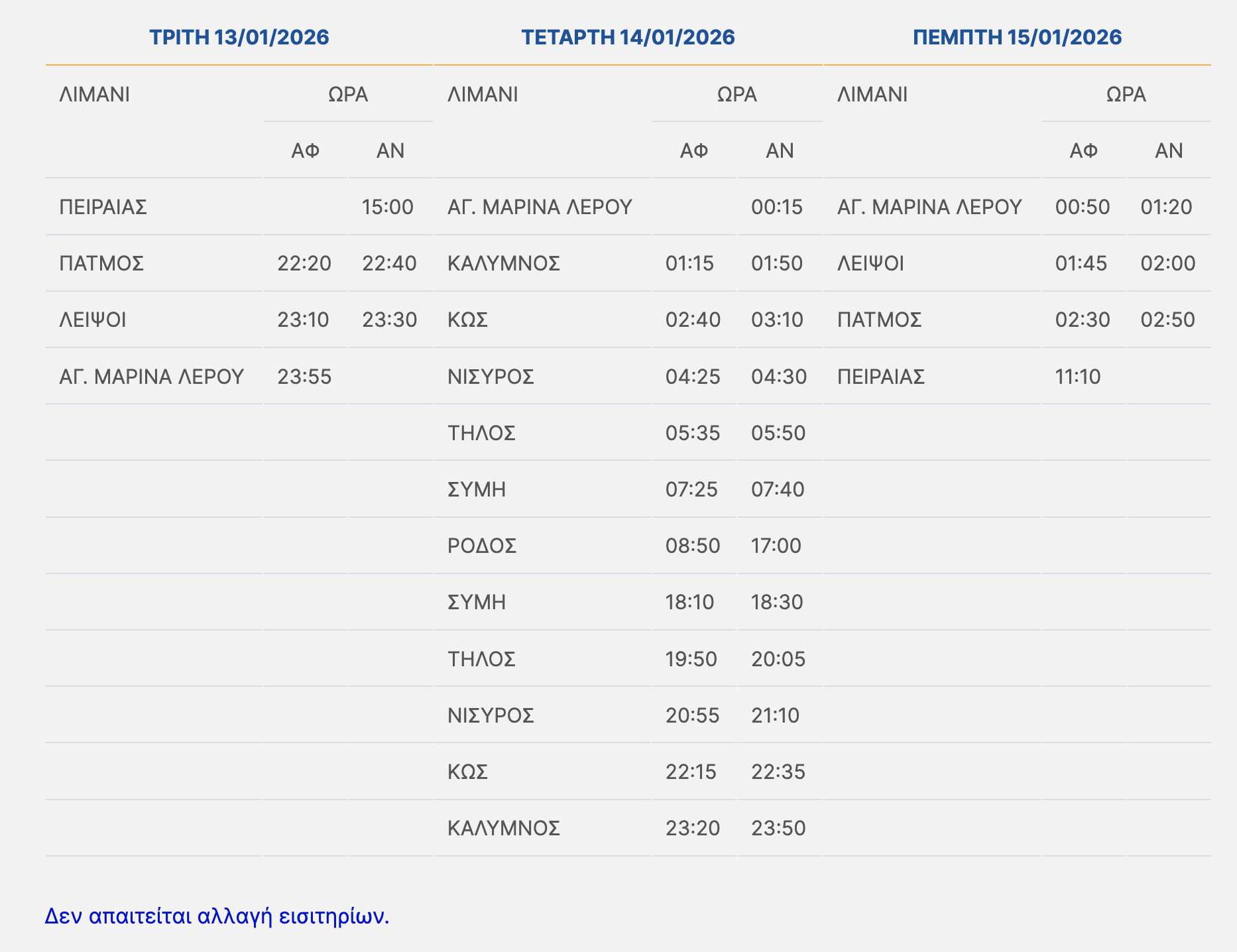 Τη Δευτέρα 12/01/2026 το πλοίο θα παραμείνει στο λιμάνι του Πειραιά και θα αναχωρήσει την Τρίτη 13/01/2026 στις 15:00 στο εγκεκριμένο δρομολόγιο με την προσθήκη λιμένων Νισύρου και Τήλου, ως ακολούθως: