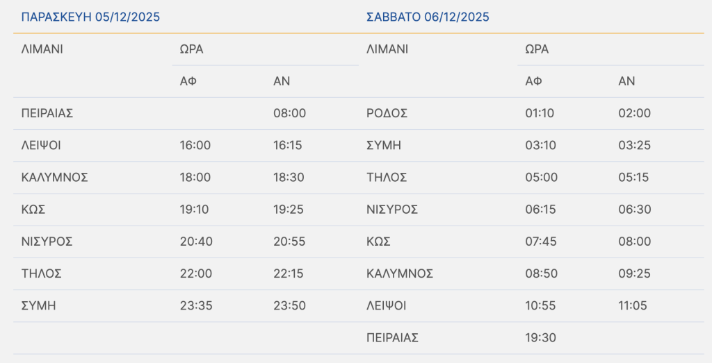 Το πλοίο θα αναχωρήσει από Πειραιά την Παρασκευή 05/12/2025, αντί την Πέμπτη 04/12/2025, και τα δρομολόγια του έως το Σάββατο 06/12/2025, θα διαμορφωθούν σύμφωνα με τον παρακάτω πίνακα: