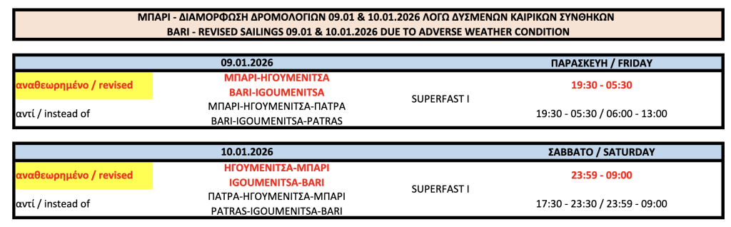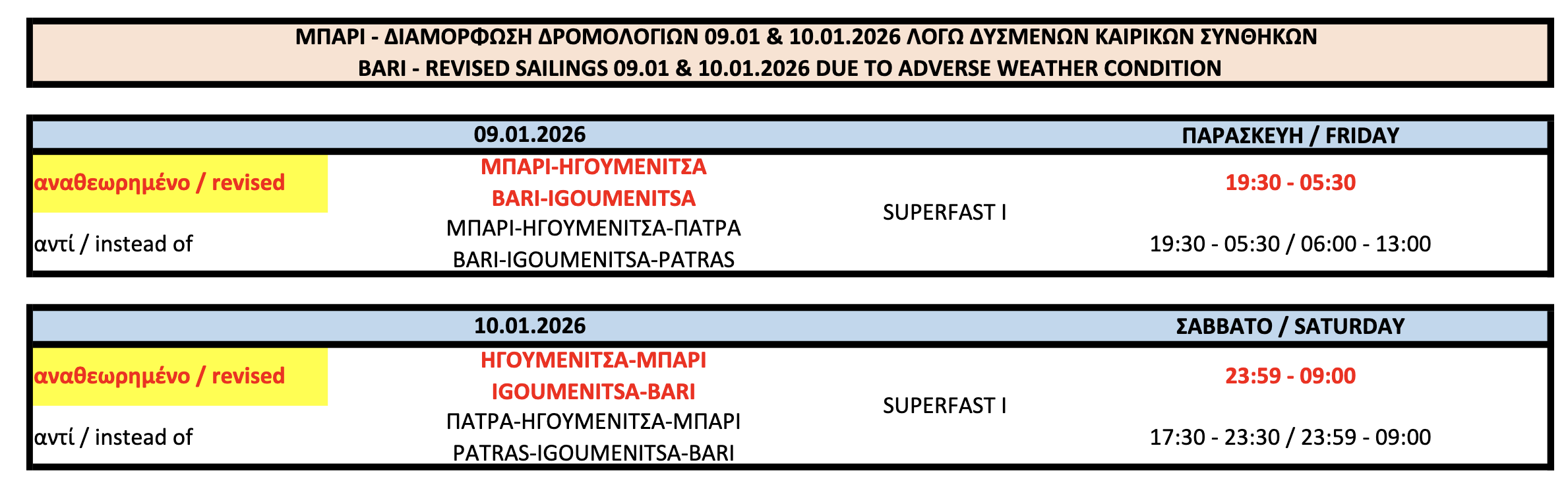 Αλλαγή στα δρομολόγια του SUPERFAST I στις 9/1 & 10/1