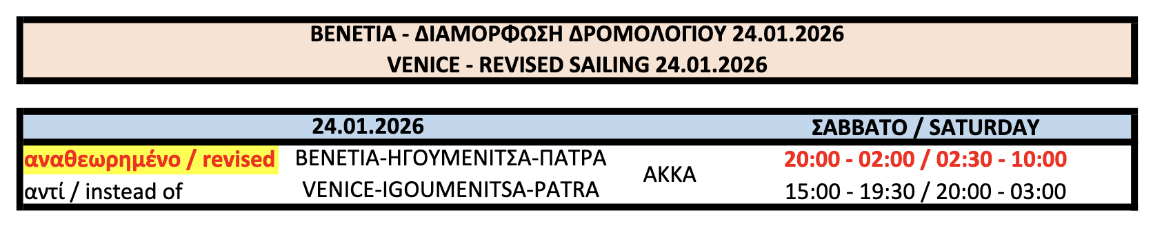 Αλλαγή ώρας αναχώρησης του AKKA από Βενετία στις 24/1
