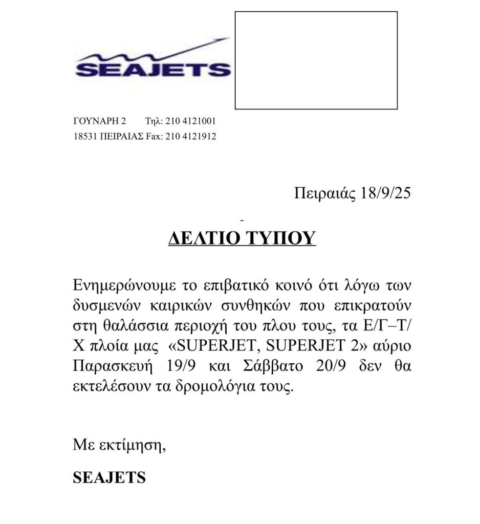 Ανεκτέλεστα λόγω καιρού τα δρομολόγια των SUPERJET & SUPERJET 2 στις 19/9 & 20/9