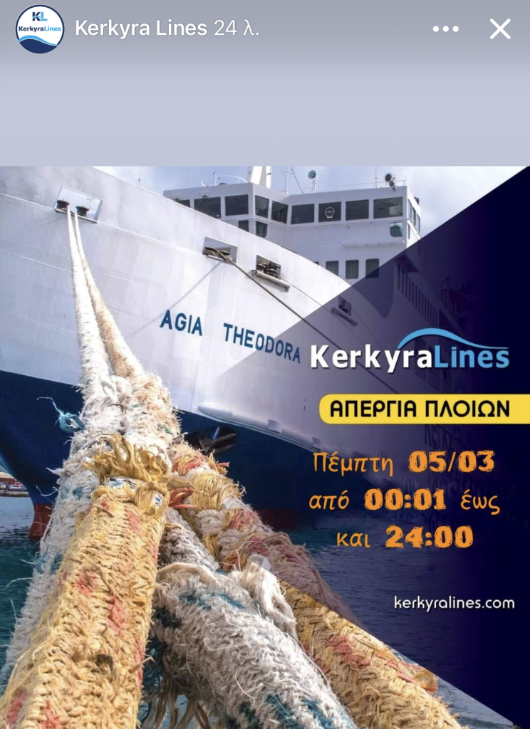 Ανεκτέλεστα τα δρομολόγια της KERKYRA LINES λόγω απεργίας την Πέμπτη 5/3