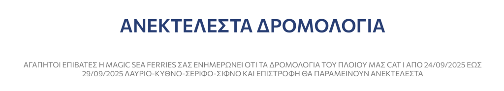 Η MAGIC SEA FERRIES ενημερώνει το επιβατικό κοινό ότι, τα δρομολόγια του CAT I από 24/9/2025 έως 29/9/2025, από Λαύριο για Κύθνο, Σέριφο, Σίφνο και επιστροφή, θα παραμείνουν ανεκτέλεστα.