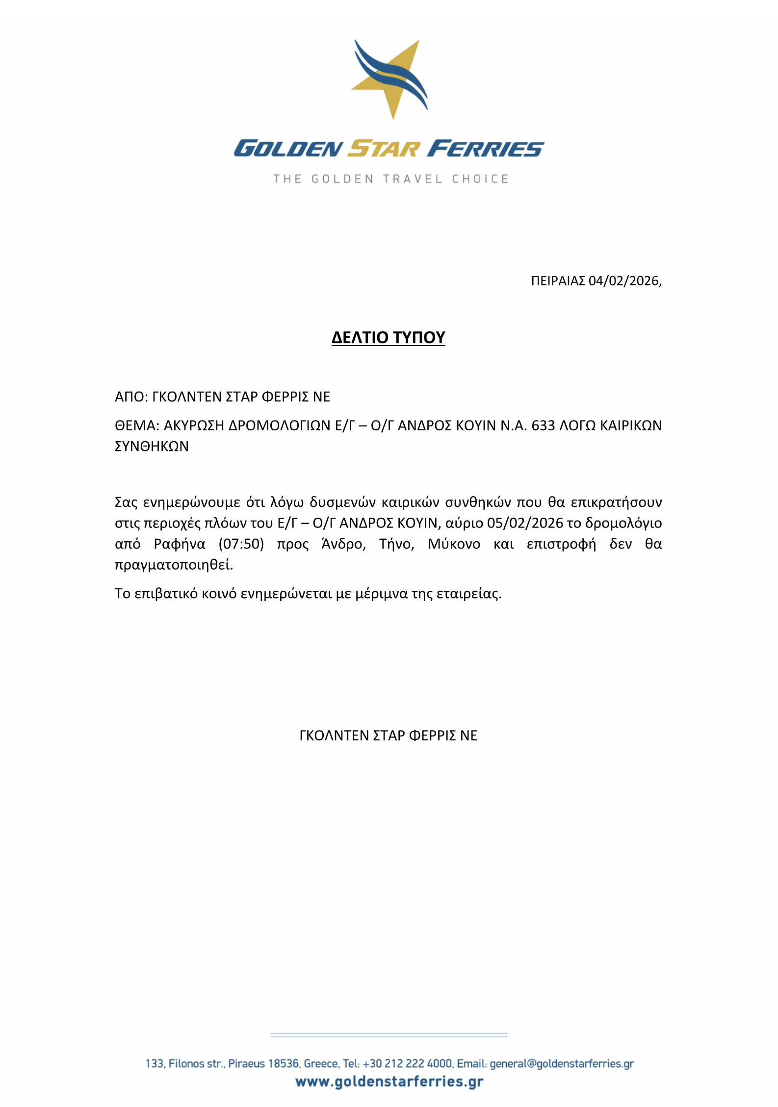 Ανεκτέλεστο λόγω καιρού το δρομολόγιο του ANDROS QUEEN στις 5/2