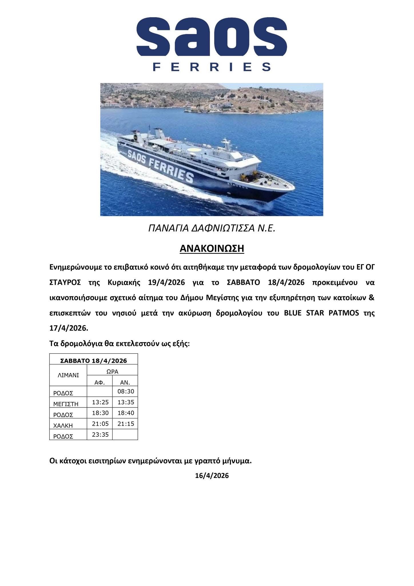 Για το Σάββατο 18/4 μεταφέρεται το δρομολόγιο της Κυριακής 19/4 του ΣΤΑΥΡΟΣ
