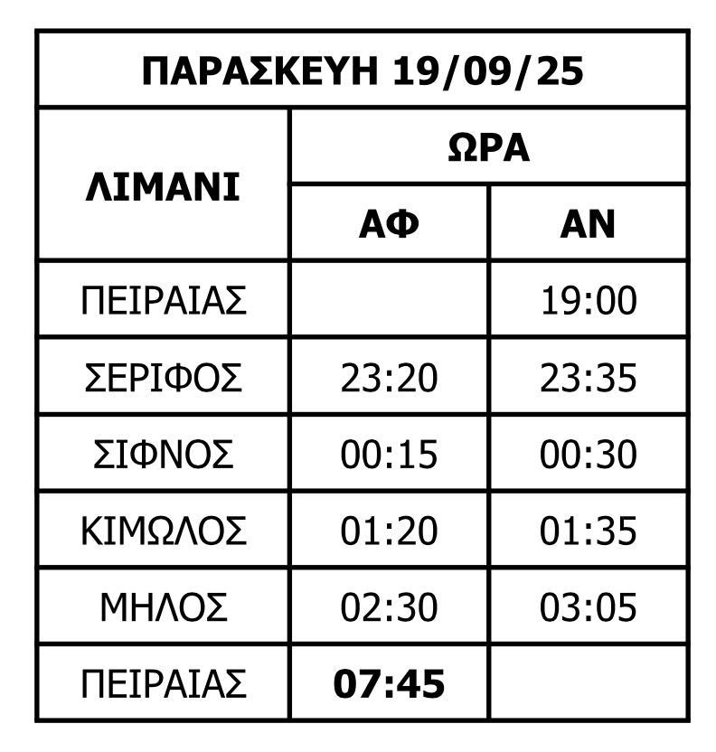 H AEGEAN SEA LINES σας ενημερώνει ότι λόγω των δυσμενών καιρικών συνθηκών, το σημερινό 19/09/25 δρομολόγιο του πλοίου ΑΝΕΜΟΣ, θα εκτελεσθεί ως ακολούθως: