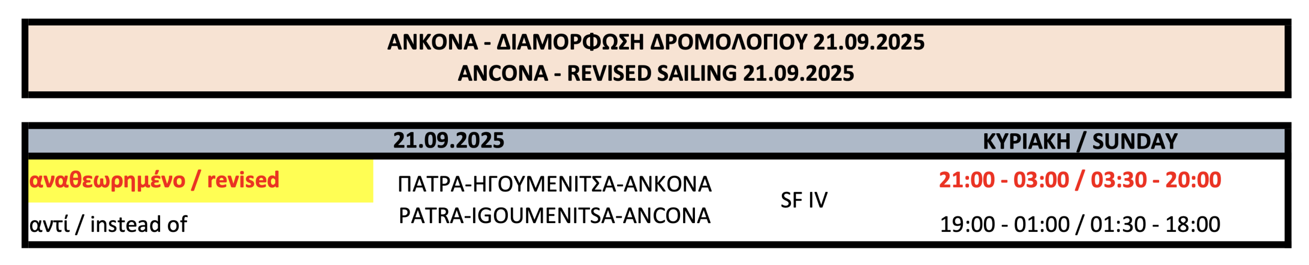 Διαμόρφωση του δρομολογίου του SUPERFAST IV προς Ανκόνα στις 21.09.2025, καθώς το λιμάνι της Ανκόνα θα είναι κλειστό για κάποιες ώρες στις 22.09, λόγω προγραμματισμένης διαδήλωσης.