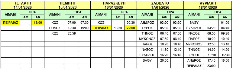 Σας γνωρίζουμε τα δρομολόγια του πλοίου μας «Φ/Γ -Ο/Γ ΤΑΛΩΣ», από Τετάρτη 14/01/2026 έως Κυριακή 18/01/2026 (άφιξη στον Πειραιά), ως κάτωθι πίνακας: