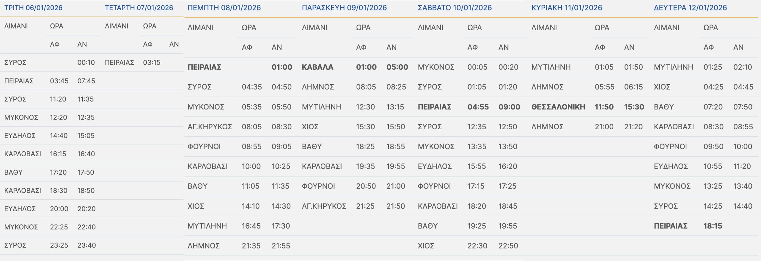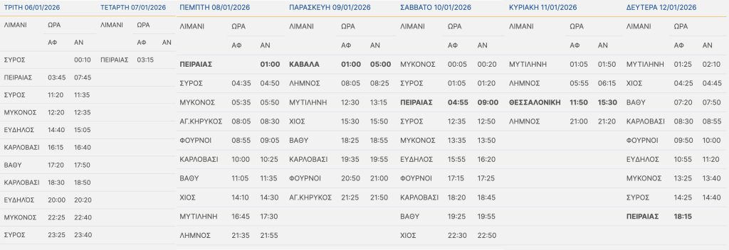 Το πλοίο μετά την άφιξη του στον Πειραιά την Τετάρτη 07/01/2026 στις 03:15, θα παραμείνει στο λιμάνι του Πειραιά και θα αναχωρήσει την Πέμπτη 08/01/2026 στη 01:00 προς Καβάλα, με τα δρομολόγια του μέχρι τη Δευτέρα 12/01/2026 να διαμορφώνονται σύμφωνα με τους παρακάτω πίνακες: