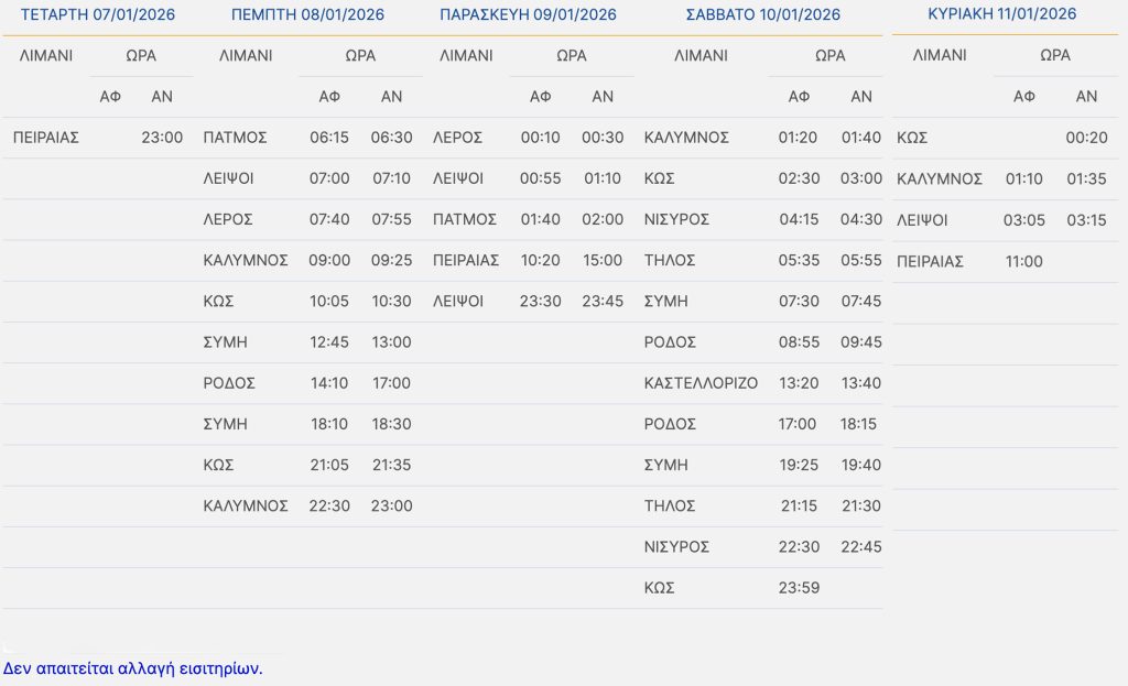 Το BLUE STAR PATMOS, λόγω δυσμενών καιρικών συνθηκών στις περιοχές πλόων του, θα παραμείνει στο λιμάνι του Πειραιά την Τρίτη 06/01/2026 και θα αναχωρήσει την Τετάρτη 07/01/2026 στις 23:00 προς Ρόδο, με τα δρομολόγια του μέχρι και την Κυριακή 11/01/2026 να διαμορφώνονται σύμφωνα με τον παρακάτω πίνακα: