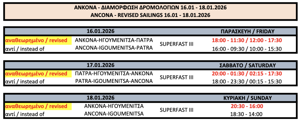 Διαμόρφωση δρομολογίων SUPERFAST III από 16/1 έως 18/1