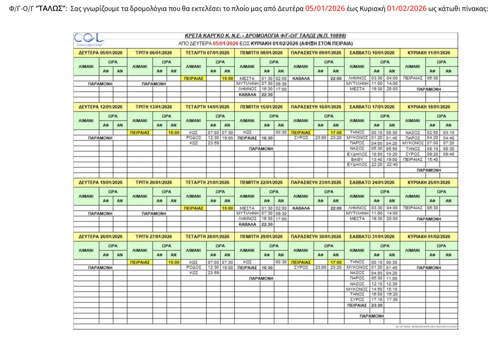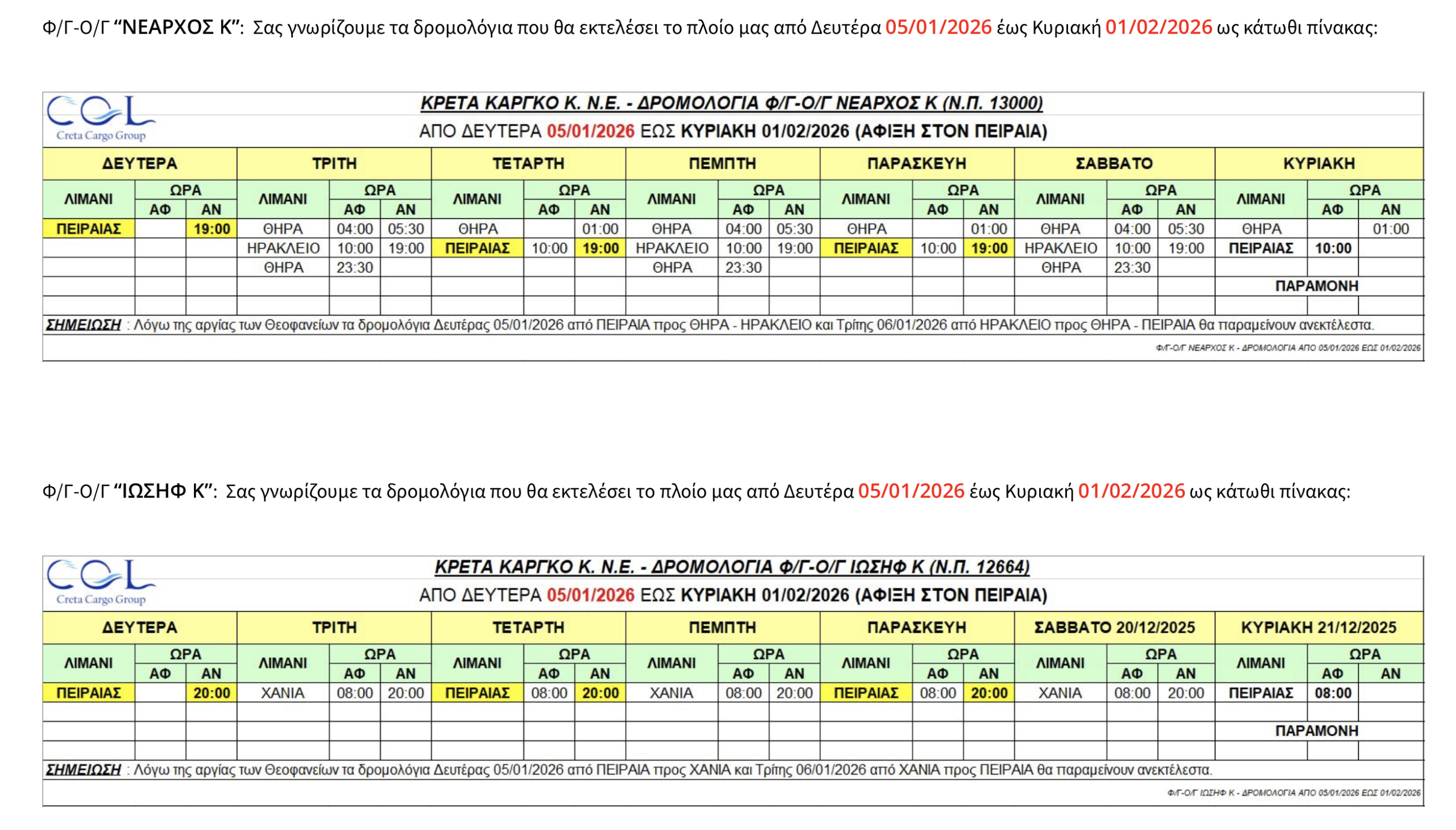 Δρομολόγια από 5/1 έως 1/2 των ΤΑΛΩΣ, ΝΕΑΡΧΟΣ Κ & ΙΩΣΗΦ Κ
