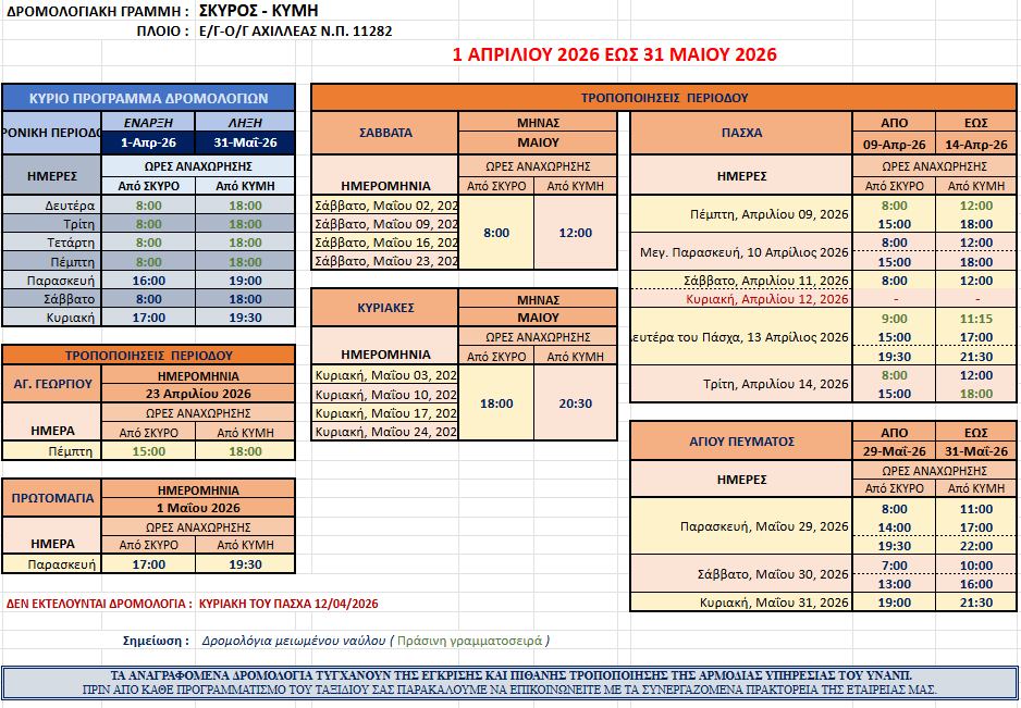 ● Η αναχώρηση στις 07:00 το πρωί κάθε Πέμπτη, κατά το θερινό τετράμηνο, σχετίζεται με την ανάγκη ανεφοδιασμού του πλοίου στην Κύμη, ενώ η ίδια πρωινή ώρα του Σαββάτου εξυπηρετεί τη μετακίνηση των φορτηγών που πραγματοποιούν αυθημερόν διαδρομές προς και από τη Σκύρο.