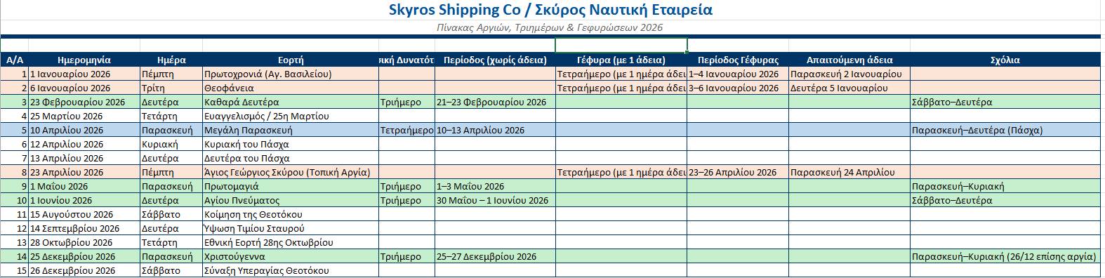 ● Για τον καλύτερο προγραμματισμό των μετακινήσεων μέσα στο 2026, σας παραθέτουμε τον Πίνακα Αργιών, Τριημέρων & Γεφυρώσεων. Στον πίνακα αποτυπώνεται με σαφήνεια ποιες γιορτές και επίσημες αργίες δημιουργούν τριήμερα και ποιες μπορούν να μετατραπούν σε τετραήμερα με την προσθήκη μίας ημέρας άδειας (όταν η αργία πέφτει Τρίτη ή Πέμπτη). Περιλαμβάνεται και η τοπική αργία του Αγίου Γεωργίου (23 Απριλίου) για τη Σκύρο. Στόχος είναι να διευκολύνουμε τον έγκαιρο σχεδιασμό ταξιδιών, εκδηλώσεων και κρατήσεων.
