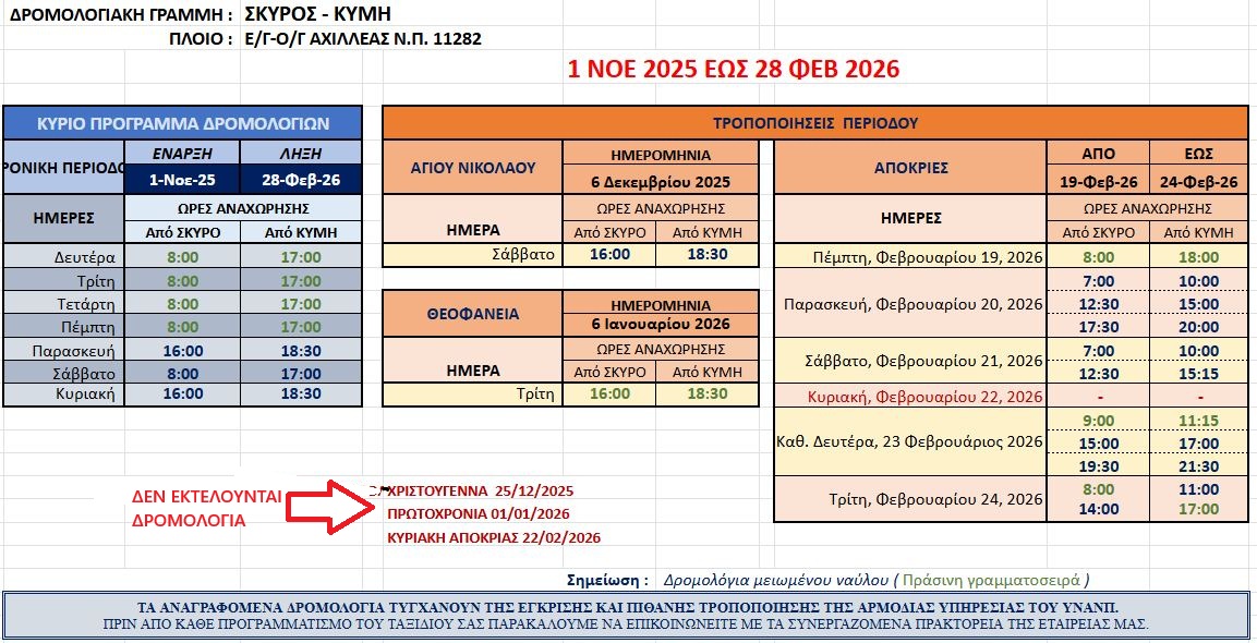 Δύο και πλέον μήνες πριν το τέλος του 2025, η Σκύρος Ναυτική Εταιρεία ανακοινώνει έγκαιρα όλα τα δρομολόγια μέχρι και τον Οκτώβριο του 2026!