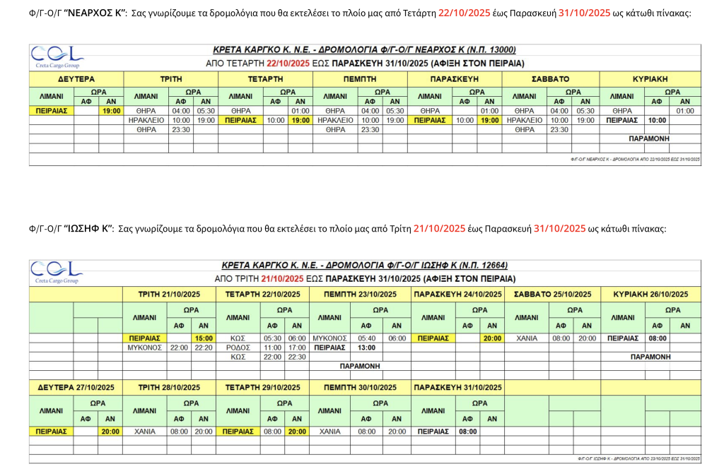Δρομολόγια των οχηματαγωγών ΝΕΑΡΧΟΣ Κ-ΙΩΣΗΦ Κ-ΤΑΛΩΣ έως 31/10