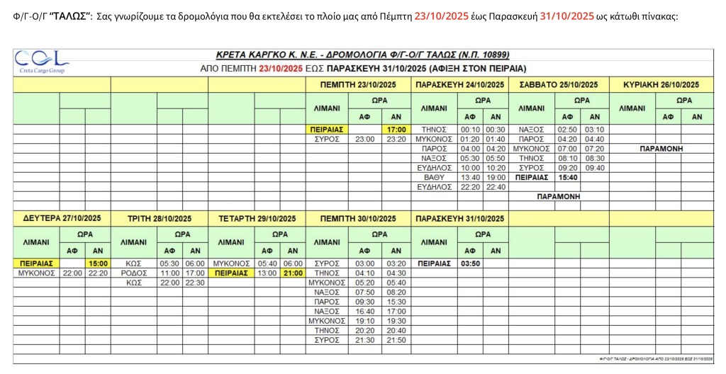Εκτός δρομολογίων το ΑΓΙΟΣ ΓΕΩΡΓΙΟΣ από 24/10 λόγω