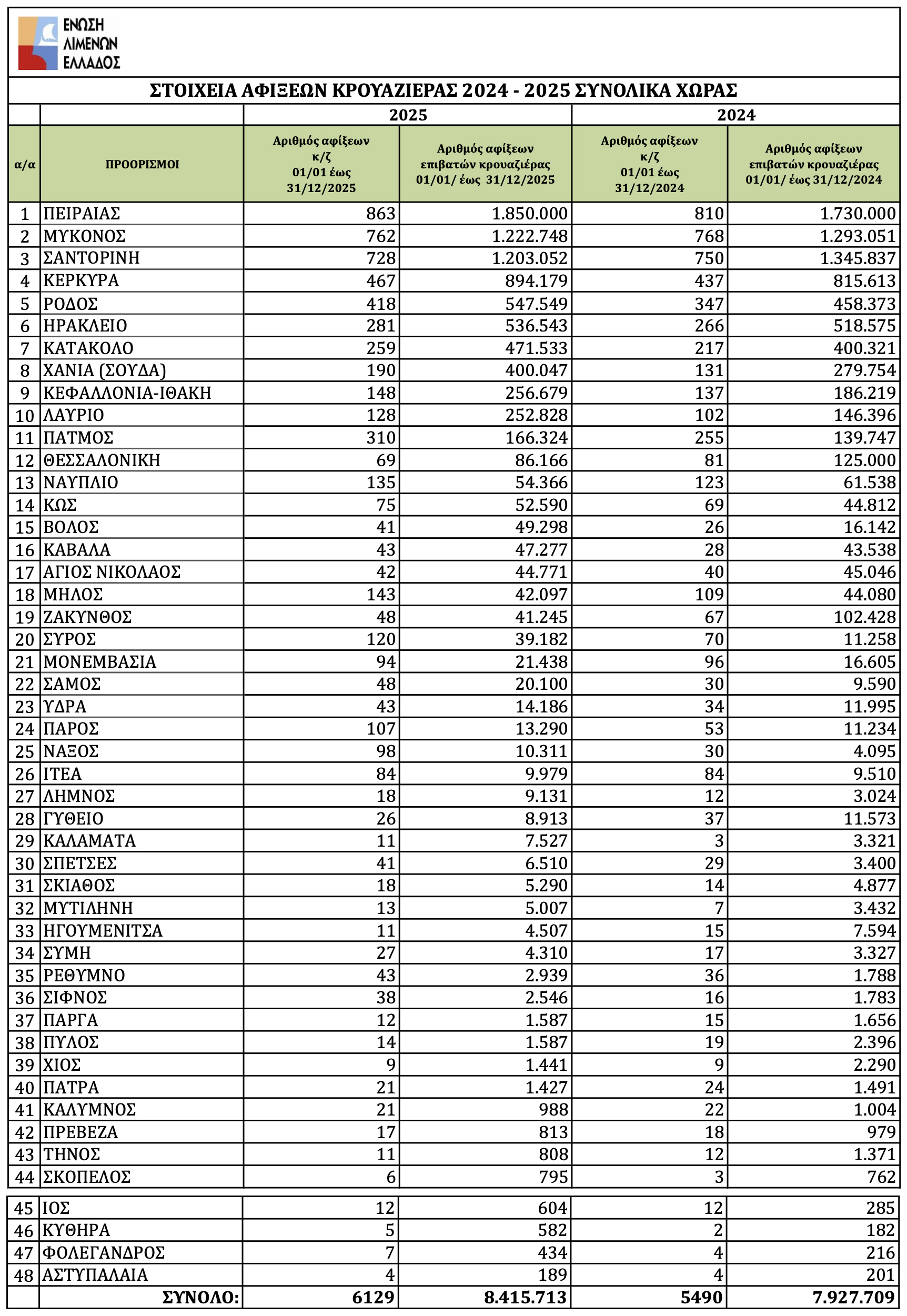 Κατά το 2025 καταγράφηκαν συνολικά 6.129 αφίξεις κρουαζιερόπλοιων στα ελληνικά λιμάνια, έναντι 5.490 αφίξεων το 2024, σημειώνοντας αύξηση 11,7%.