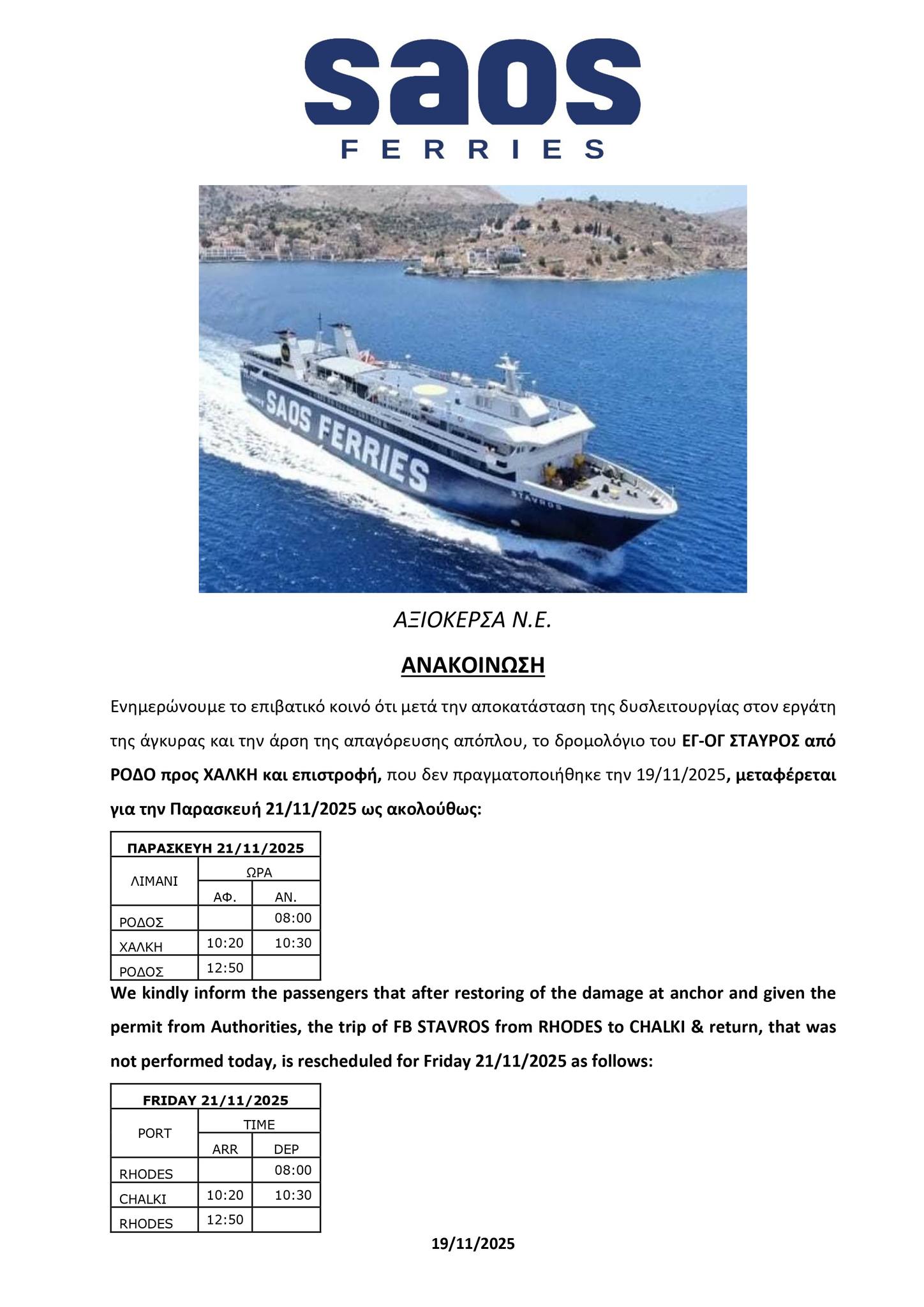 Μεταφορά δρομολογίου Ε/ΓΟ/Γ ΣΤΑΥΡΟΣ την Παρασκευή 21/11