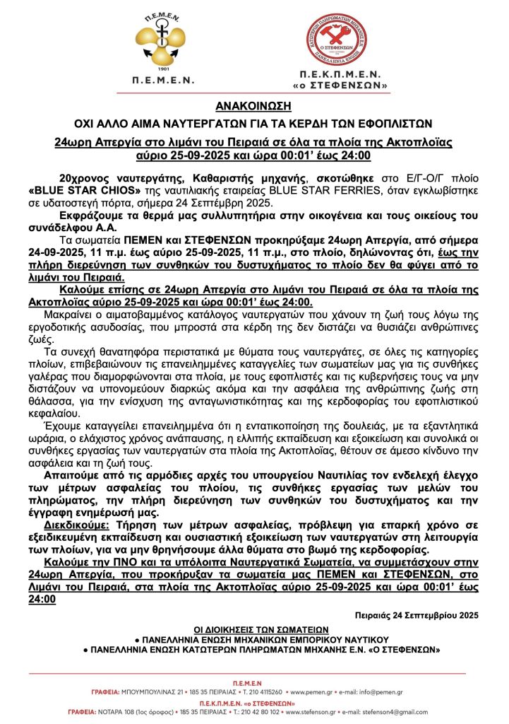 Κάλεσαν επίσης σε πανλιμενική 24ωρη απεργία στον Πειραιά αύριο, Πέμπτη 25 Σεπτεμβρίου, από τις 00:01 μετά τα μεσάνυχτα έως τις 24:00, σε όλα τα πλοία της ακτοπλοΐας.