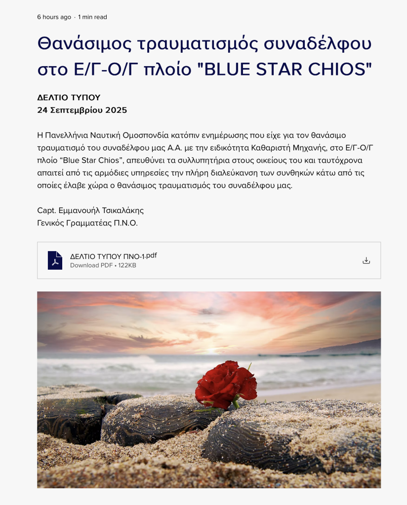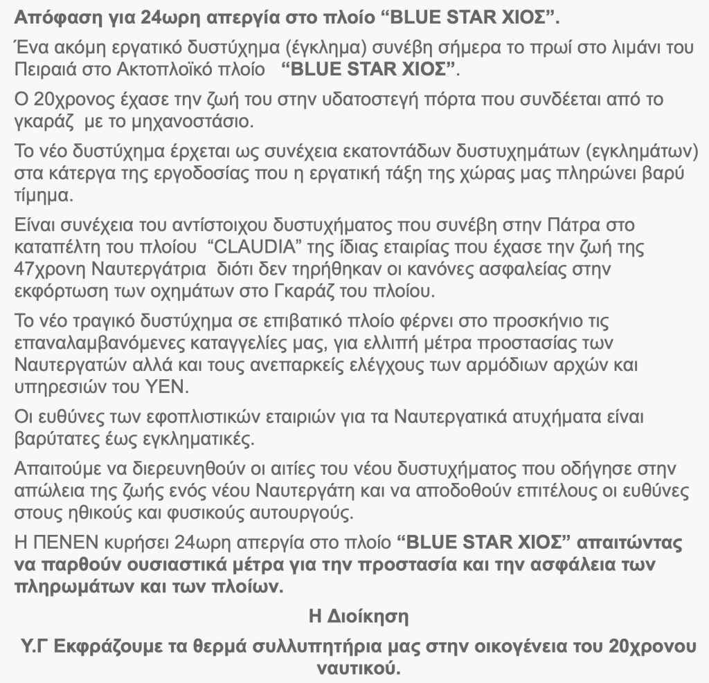 Τα ναυτεργατικά σωματεία ΠΕΜΕΝ και ΣΤΕΦΕΝΣΩΝ προκήρυξαν 24ωρη απεργία στο Ε/Γ-Ο/Γ BLUE STAR CHIOS, λόγω του τραγικού δυστυχήματος και τον θάνατο του 20χρονου ναυτικού, από τις 11:00 σήμερα έως τις 11:00 αύριο, τονίζοντας ότι το πλοίο δεν θα αποπλεύσει μέχρι να διερευνηθούν πλήρως οι συνθήκες του δυστυχήματος.