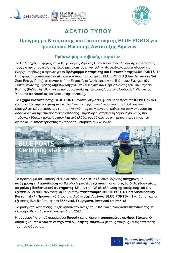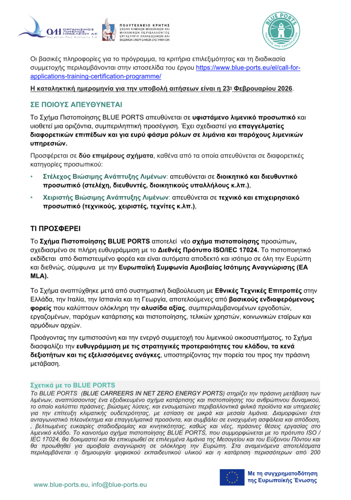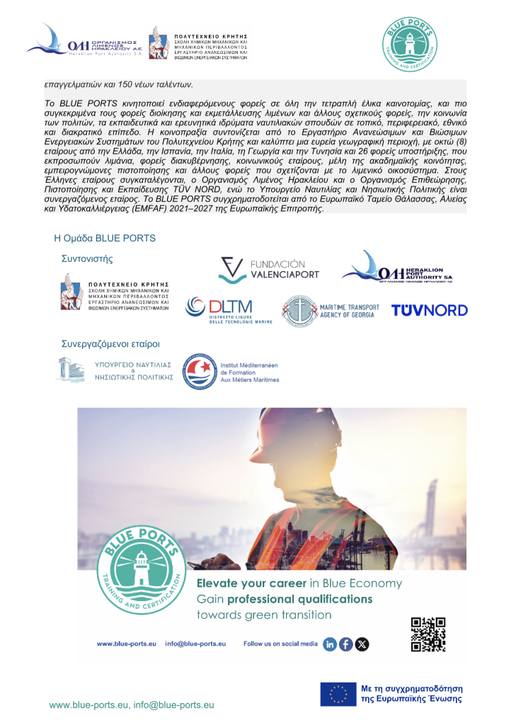 ΟΛΗ: Πρόγραμμα κατάρτισης & πιστοποίησης BLUE PORTS για προσωπικό βιώσιμης ανάπτυξης λιμένων