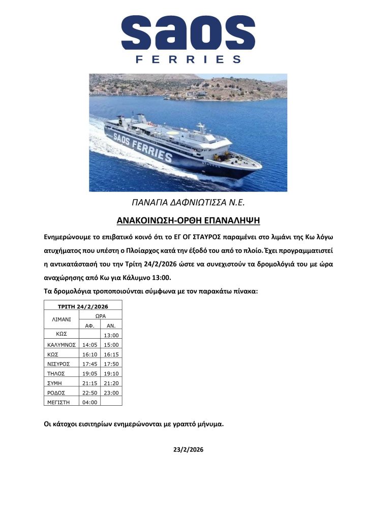 Η βλάβη αποκαταστάθηκε με ίδια μέσα, ενώ πριν τον απόπλου για το λιμάνι της Καλύμνου, διαπιστώθηκε ότι ο 45χρονος Πλοίαρχος του πλοίου είχε υποστεί τραυματισμό στο αριστερό πόδι.