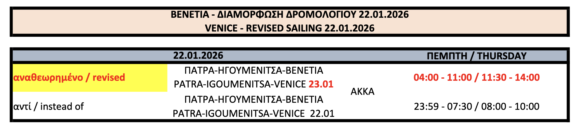 Αλλαγή ώρας αναχώρησης του AKKA από Βενετία στις