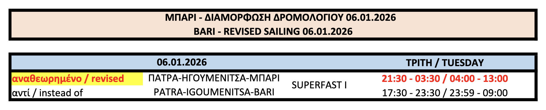 Στις 21.30 (αντί 17.30) η αναχώρηση του SUPERFAST I από Πάτρα στις 6/1