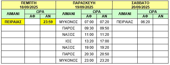 Λόγω δυσμενών καιρικών συνθηκών που επικρατούν στις περιοχές πλόων του πλοίου μας Φ/Γ-Ο/Γ «ΤΑΛΩΣ» και καθυστερημένου κατάπλου στον ΠΕΙΡΑΙΑ, σας γνωρίζουμε ότι το ανωτέρω πλοίο θα αναχωρήσει σήμερα Πέμπτη 18/09/2025 από τον λιμένα του ΠΕΙΡΑΙΑ στις 23:59 αντί στις 20:00, προς ΜΥΚΟΝΟ – ΠΑΡΟ – ΝΑΞΟ – ΙΟ, και το δρομολόγιο θα εκτελεστεί ως κάτωθι πίνακας: