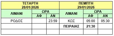 Σας γνωρίζουμε ότι το πλοίο Φ/Γ-Ο/Γ «ΤΑΛΩΣ» θα αναχωρήσει σήμερα Τετάρτη 28/01/2026 από ΡΟΔΟ στις 23:59 (αντί αύριο Πέμπτη 29/01/2026 στις 02:00), προς ΚΩ – ΠΕΙΡΑΙΑ και το δρομολόγιο θα εκτελεστεί ως κάτωθι πίνακας: