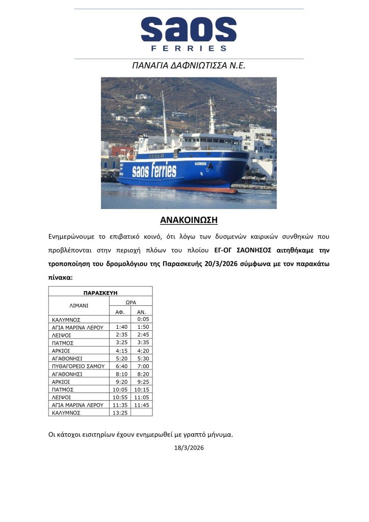 Τροποποίηση δρομολογίου ΣΑΟΝΗΣΟΣ την Παρασκευή 20/3