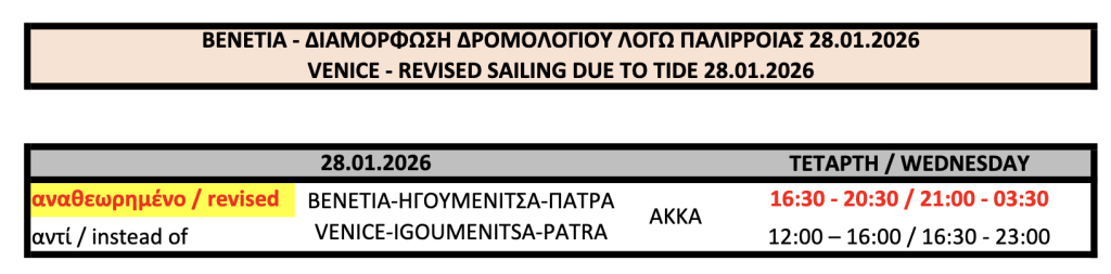 Τροποποίηση δρομολογίου AKKA από Βενετία στις 28/1