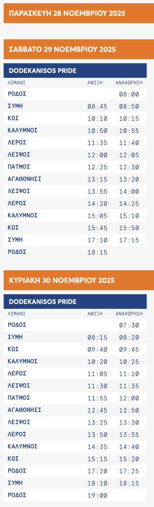 Αγαπητοί επιβάτες, σας ενημερώνουμε ότι τα δρομολόγια του πλοίου «Dodekanisos Pride» από την Παρασκευή 28/11/2025 έως και την Κυριακή 30/11/2025, θα τροποποιηθούν λόγω των αναμενόμενων δυσμενών καιρικών συνθηκών.