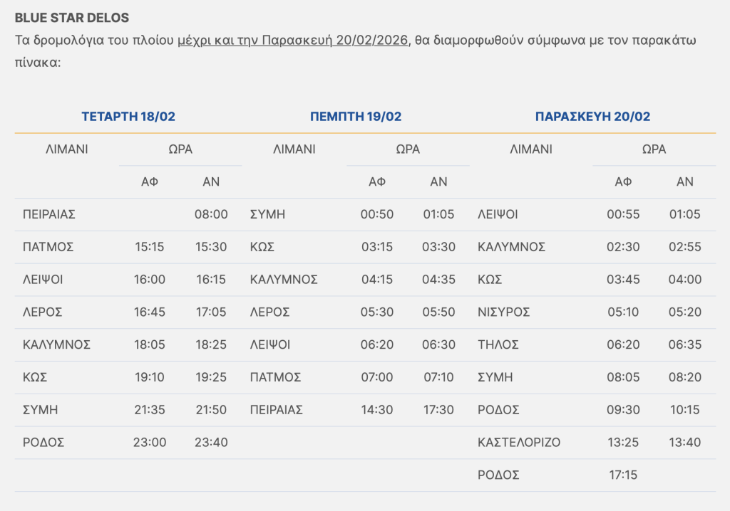 Τροποποίηση δρομολογίων BLUE STAR DELOS 18/2-20/2