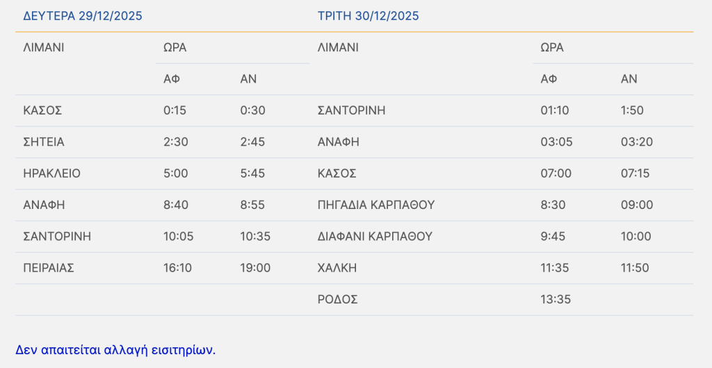 - ΤΡΙΤΗ 30/12/2025: Το πλοίο θα αναχωρήσει από Ρόδο στις 21:00 (αντί 15:00) για Χάλκη 22:45-23:00, Διαφάνι 00:35-00:50, Πηγάδια 01:35-02:00, Κάσο 03:15-03:30, Ανάφη 07:10-07:25, Θήρα 08:40-09:00, Πειραιάς 14:35