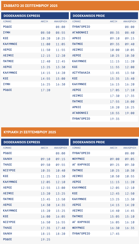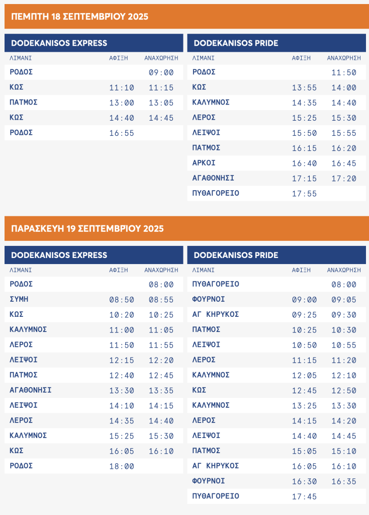 Σας ενημερώνουμε ότι τα δρομολόγια των πλοίων «Dodekanisos Pride» και «Dodekanisos Express» από την Πέμπτη 18/09/2025 έως και την Κυριακή 21/09/2025, θα τροποποιηθούν λόγω των αναμενόμενων δυσμενών καιρικών συνθηκών.