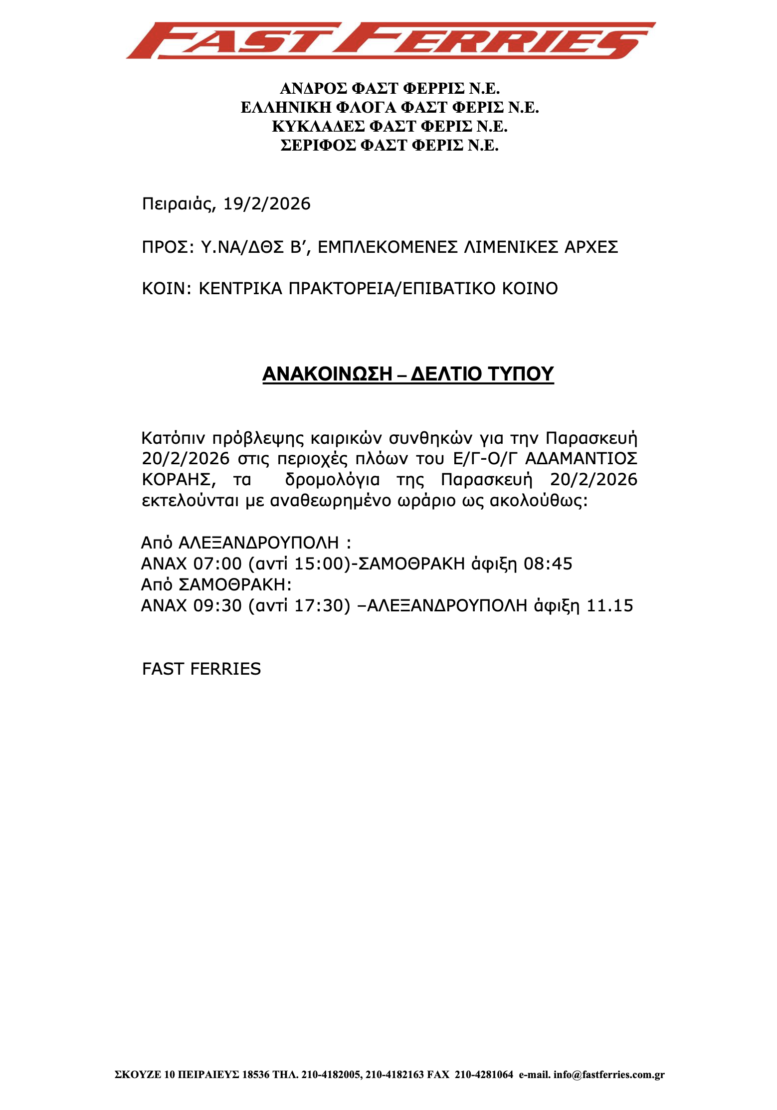 Τροποποίηση στα δρομολόγια του ΑΔΑΜΑΝΤΙΟΣ ΚΟΡΑΗΣ την Παρασκευή 20/2