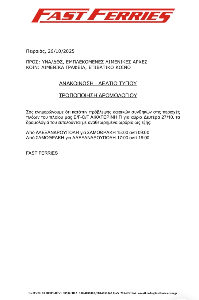 Τροποποίηση στα δρομολόγια του ΑΙΚΑΤΕΡΙΝΗ Π στις 27/10 λόγω καιρικών συνθηκών