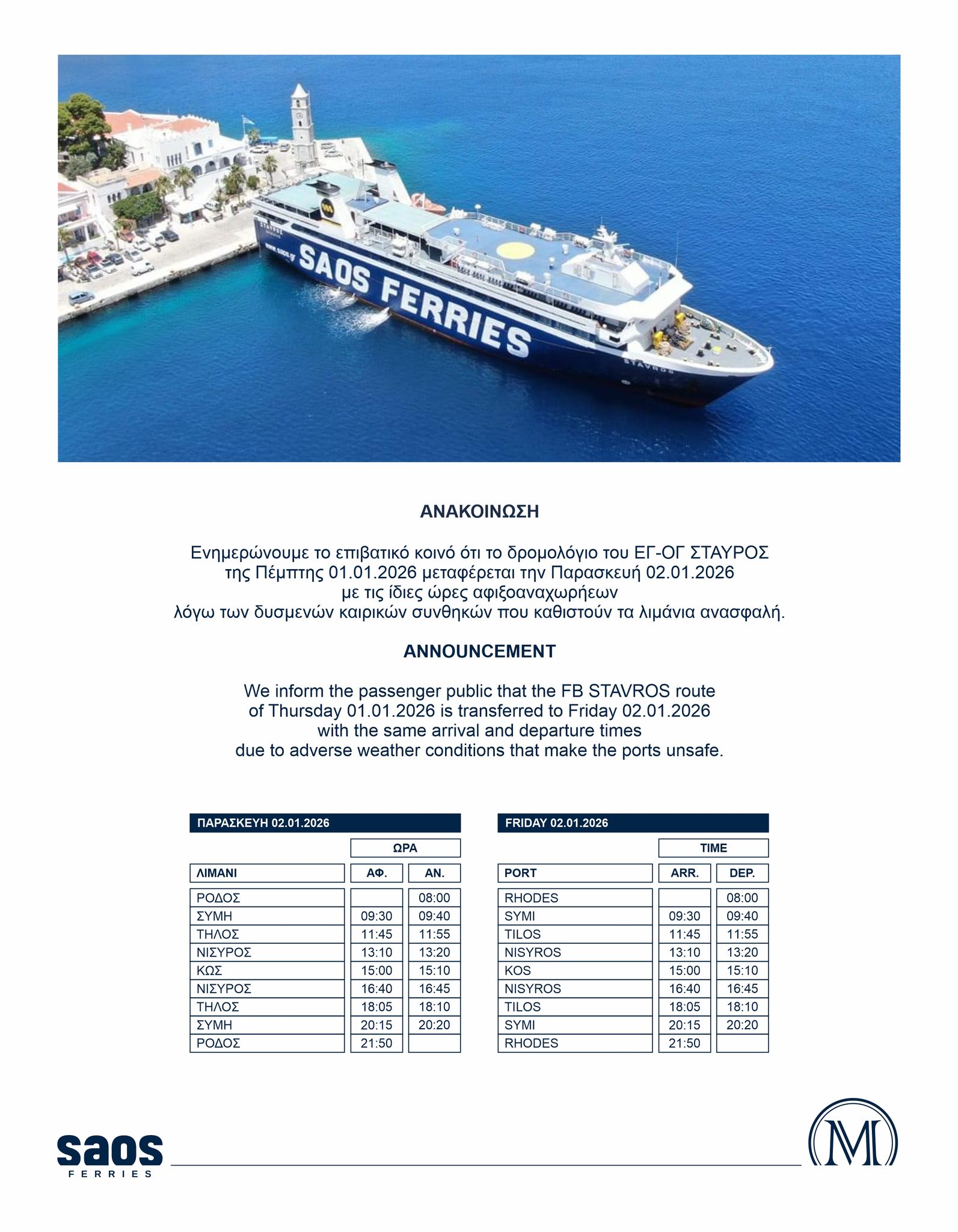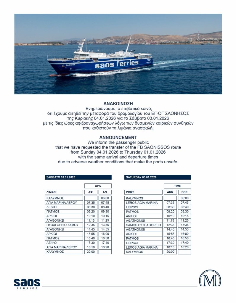 Τροποποίηση στα δρομολόγια των ΣΑΟΝΗΣΟΣ & ΣΤΑΥΡΟΣ