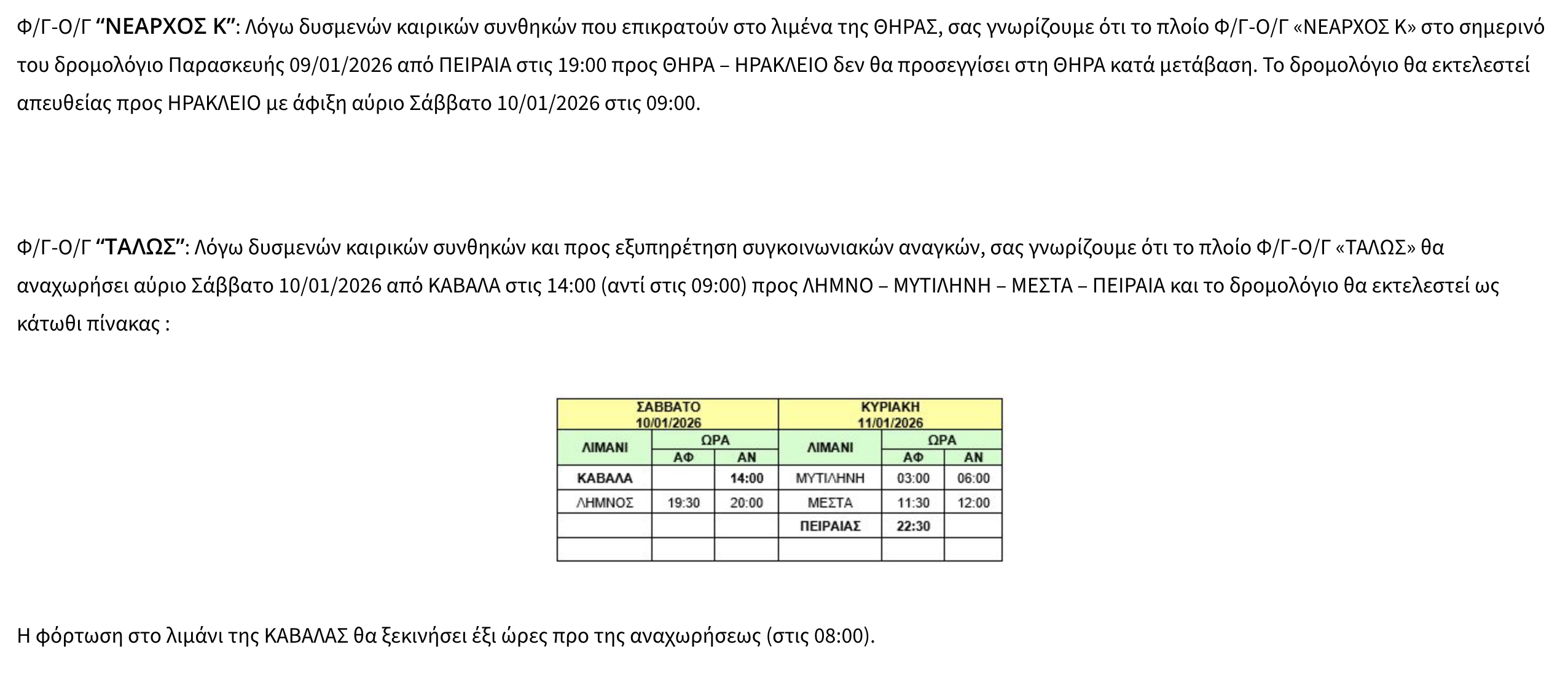 Τροποποίηση στα δρομολόγια των ΤΑΛΩΣ & ΝΕΑΡΧΟΣ Κ λόγω καιρικών συνθηκών