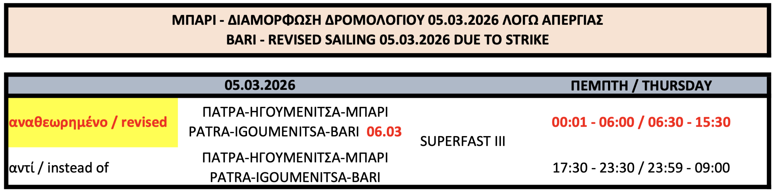 Διαμόρφωση του δρομολογίου του SUPERFAST III προς Μπάρι στις 05.03.2026, λόγω της 24ης απεργίας της ΠΝΟ: