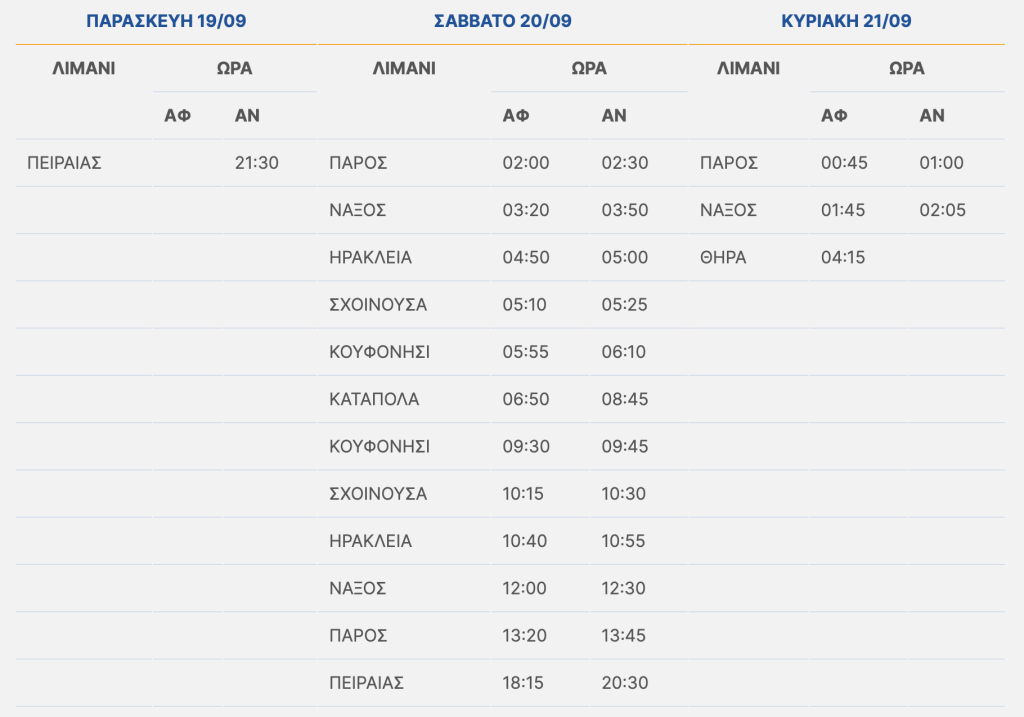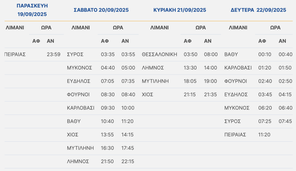 - Το πλοίο θα αναχωρήσει από Πειραιά την 23:59 (αντί 15:00) και μέχρι τη Δευτέρα 22/09/2025, τα δρομολόγιά του, θα τροποποιηθούν σύμφωνα με τον παρακάτω πίνακα: